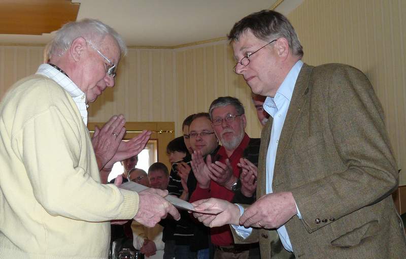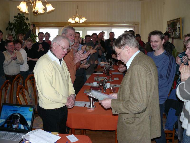 Deshalb war es ein sehr emotionaler Moment, als Klaus Tanneberg seine Ehrenmitgliedsurkunde aus den Händen des 1. Vorsitzenden Ullrich Schwarz entgegennahm und alle seine Flugkameraden aufstanden und ihm in tiefer Dankbarkeit lange Zeit stehend applaudierten. In seiner bekannten Art machte Klaus Tanneberg keine langen Worte, nahm aber bewegt und gerührt die Ehrung entgegen.