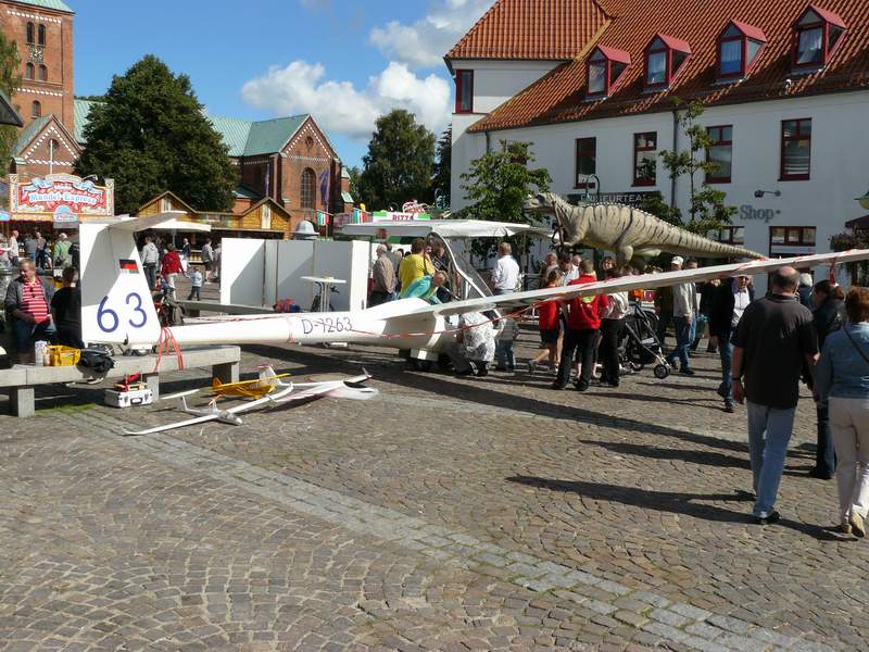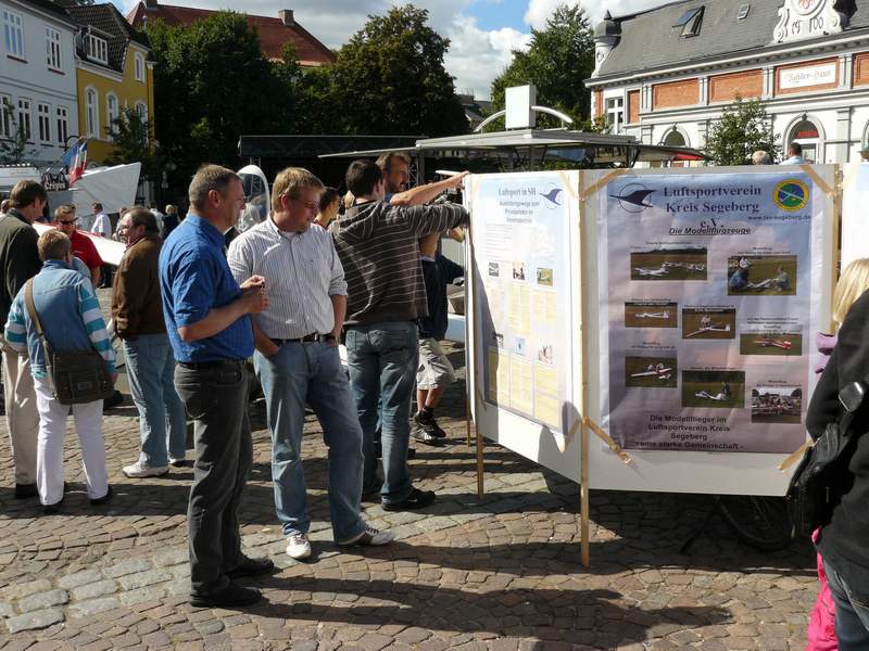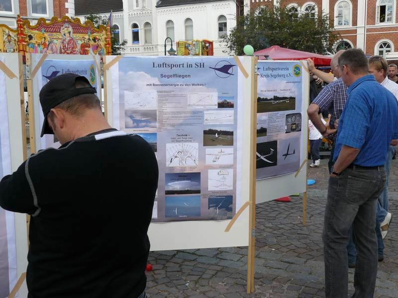 as Stadtfest im Bad Segeberg ist ein fester Bestandteil im Terminkalender des Luftsportvereins Kreis Segeberg. Mehrere tausend Besucher flanieren dann durch die Kreisstadt und lassen sich von den vielen Amüsements und Informationsangeboten inspirieren. Deshalb nutzt der Luftsportverein in jedem Jahr die Möglichkeit, sich mit einem Segelflugzeug mitten auf dem Marktplatz zu präsentieren. Die DG 101 hat sich als ideales Ausstellungsflugzeug herausgestellt und bietet Groß und Klein ein sehr schönes Gefühl im Cockpit. Viele erfahrere Fluglehrer und Piloten stellten sich auch dieses Jahr wieder zur Verfügung, um über den schönen Luftsport aus erster Hand zu berichten. Auch viele Schautafeln dienten unterstützend als Anschauungsmaterial für die Interessierten. Die Sonne lachte über Bad Segeberg, so dass der Besucherstrom am Stand nicht abriss. Neben dem Fortgeschrittenen-Einsitzer wurden aber auch die ersten Flugversuche anhand von Modellen eindrucksvoll ausgestellt und die Brücke vom Modellsport zum Flugsport geschlagen. So war für die Besucher in jeder Hinsicht etwas geboten und den Standbetreuern ging das Gesprächsthema nie aus. Angehängte Bilder: