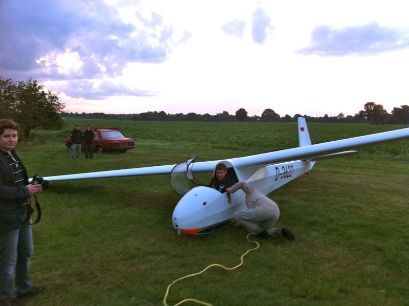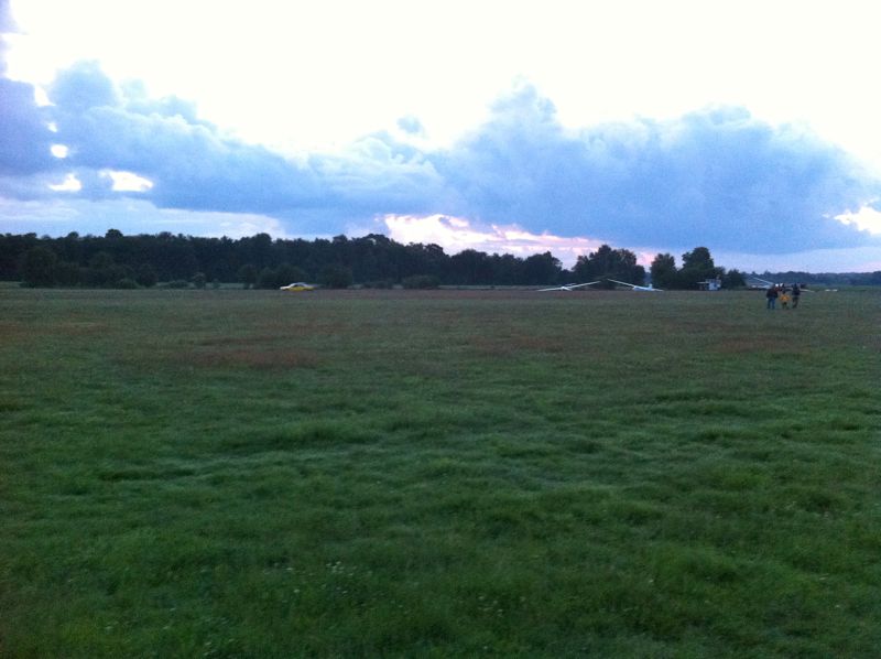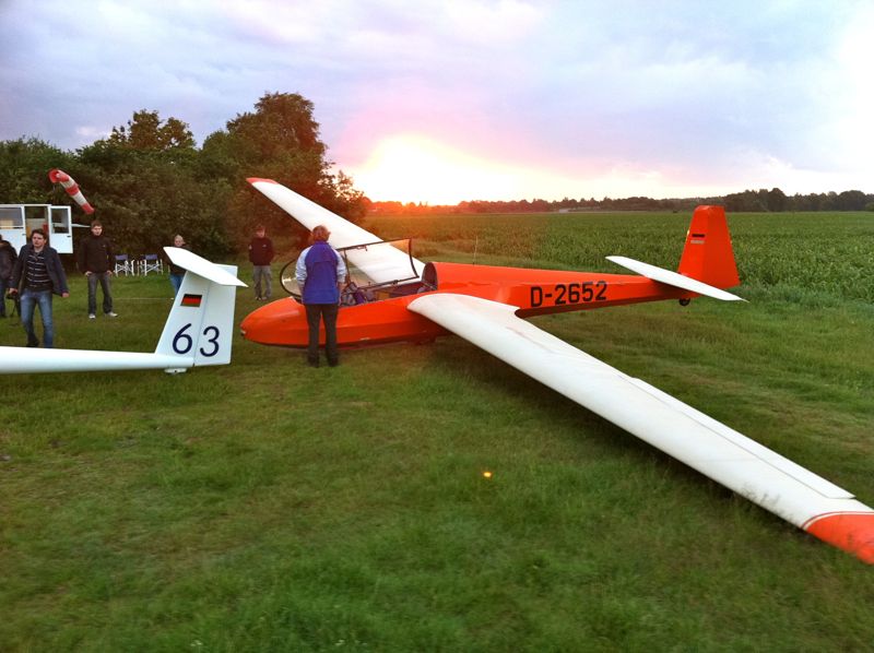 Zu unser aller Erleichterung war die Winde danach startklar. Nach Aufbau des Starts waren die Flugzeuge leider deutlich kühler als die Morgenluft - mit dem Ergebnis, dass die Hauben, kaum abgetrocknet, schon wieder beschlugen. Da hieß es dann, nach Einklinken zügig in die Luft zu kommen. Nahezu pünktlich zum Sonnenaufgang (04:47Uhr +/- ) war die ASK13 eingeklinkt - und die Sonne wolkenverhangen. Das tat dem Enthusiasmus der Piloten keinen Abbruch. Und kurze Zeit später zeigte sich die Sonne auch im gewünscht herrlichen Farbenspiel am Horizont.
