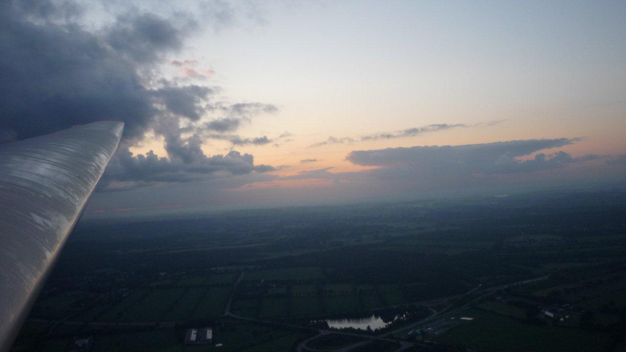 Das Schönste am Fliegen um diese Uhrzeit ist neben dem Blick auf die aufgehende Sonne immer wieder die Ruhe in der Luft. Das Flugzeug gleitet wie auf Schienen dahin, das Variometer ist wie auf -0,5m/s festgeklebt.