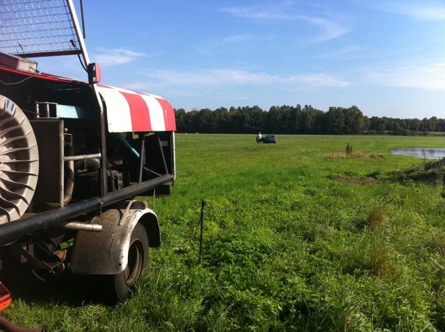 Also wurde die Aufnahme des Flugbetriebes beschlossen, und die Winde machte sich auf den Weg. Nach 5 Minuten war jedoch klar, dass der Weg noch eine Überraschung bereithielt. Das Fahrzeug hatte angesichts eines moorigen Loches im Weg eigene Vorstellungen von der einzuschlagenden Richtung und rutschte vom Weg in den tiefen Boden ab, die Räder der rechten Seite versanken fast bis zur Achse. Hier war mit Schaufeln nichts auszurichten.