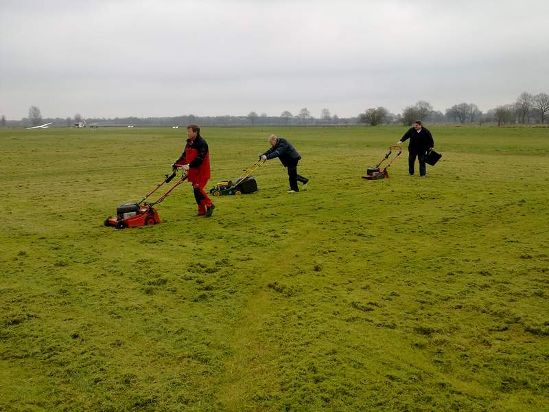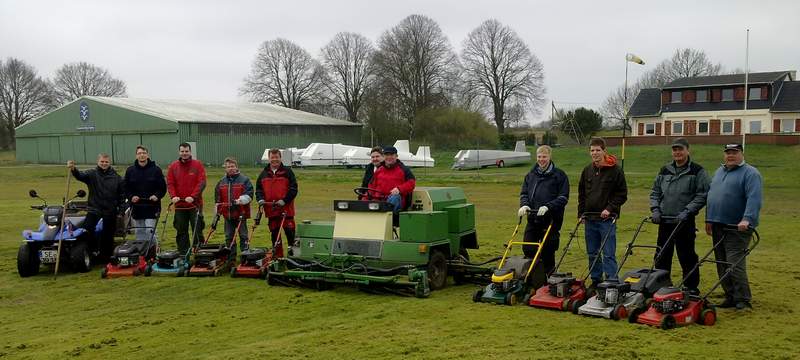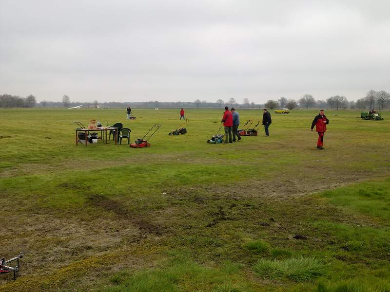 ei kaltem Wind und vielen Wolken herrschte auf dem Modellflugplatz emsiges Treiben. Eine Armada von technischem Gerät wurde herangeschafft, um dem verfilzten Grün nach der langen Winterzeit neues Leben einzuhauchen. Die Vertikutierer und Rasenmäher leisteten phantastische Arbeit, denn die Hügel aus Moos und alten Gräsern wuchsen zuhauf auf der grünen Fläche empor. Von dort wurden sie per Quad und Anhänger eingesammelt und verschwanden beim Sammelplatz. Frisches, helles Grün kam immer mehr zum Vorschein und nach etlichen Stunden der Arbeit war es vollbracht: Der Modellflugplatz kann wieder atmen und neuer Rasen wird entstehen. Für das leibliche Wohl für die vielen fleißigen Modellflieger wurde mit heißem Kaffee und Kuchen gesorgt. Derweil beobachtete Frank Heitmann mit einem UFO-ähnlichen Flugmodell die Arbeiten mit seiner Kamerabrille. Das von vier Propellern angetriebene Flugobjekt kann sich schnell in der Luft bewegen, aber auch wie ein Hubschrauber exakt an einer Stelle "stehen" bleiben. Barometrisch wird die Höhe präzise überwacht und eingehalten. Ein beeindruckendes Flugobjekt, das Frank Heitmann da wieder in die Luft gebracht hat.